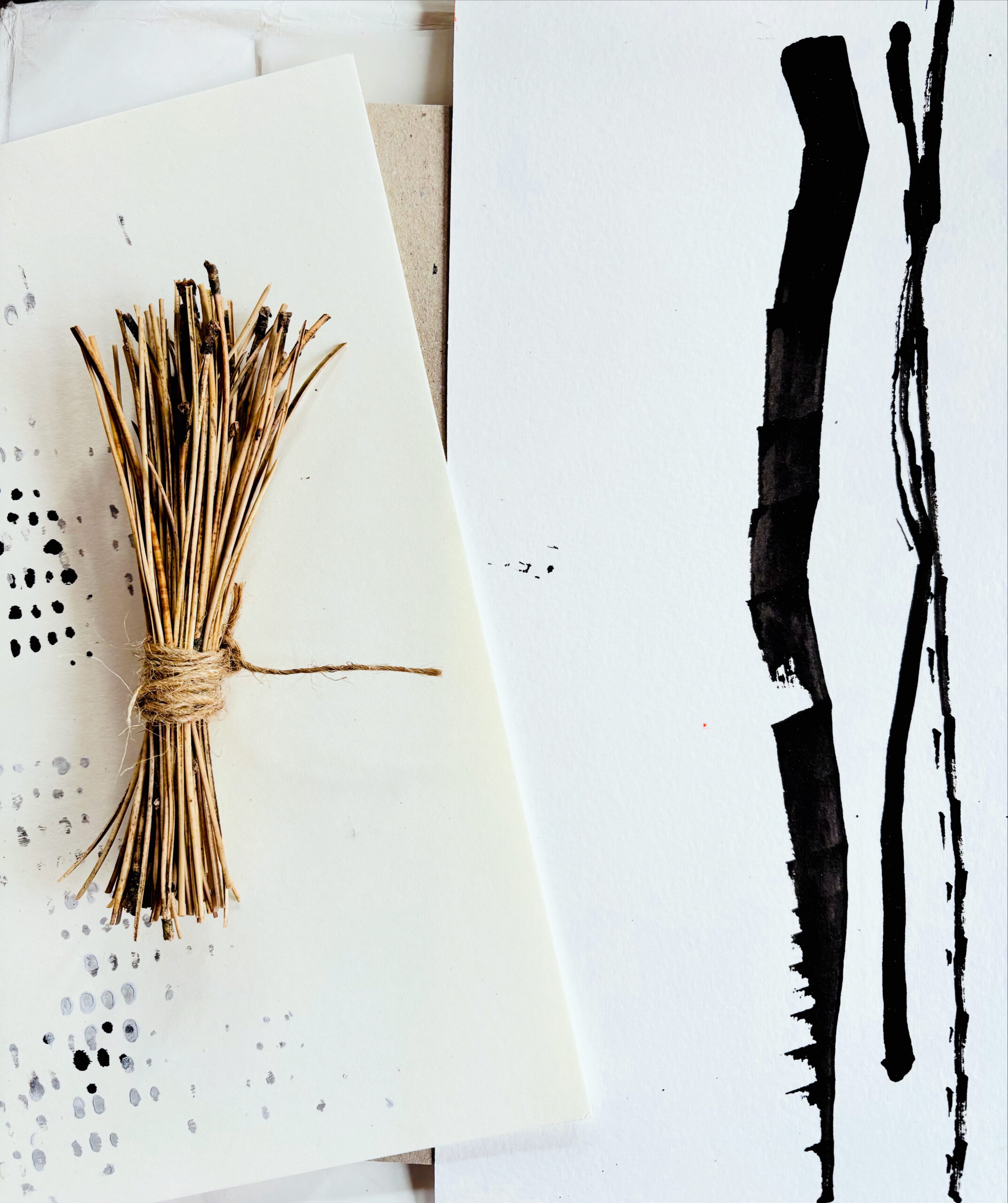 Ich beziehe gerne Naturmaterialien oder andere ungewöhnliche Malmittel ein und trete mit ihnen in einen gestalterischen Dialog.
